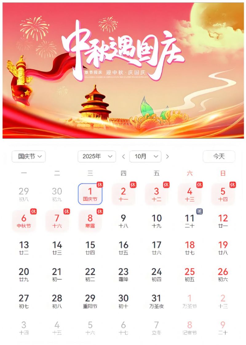 [10月1日-10月8日(放假调休),共八天。10月9日(星期四)正常上班。恭祝朋友们国庆中秋双节快乐、生活喜乐、阖家幸福!